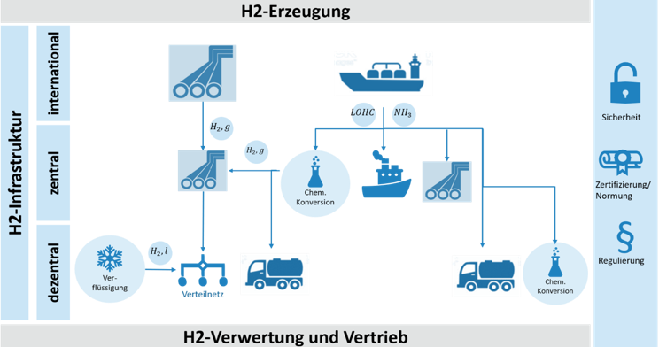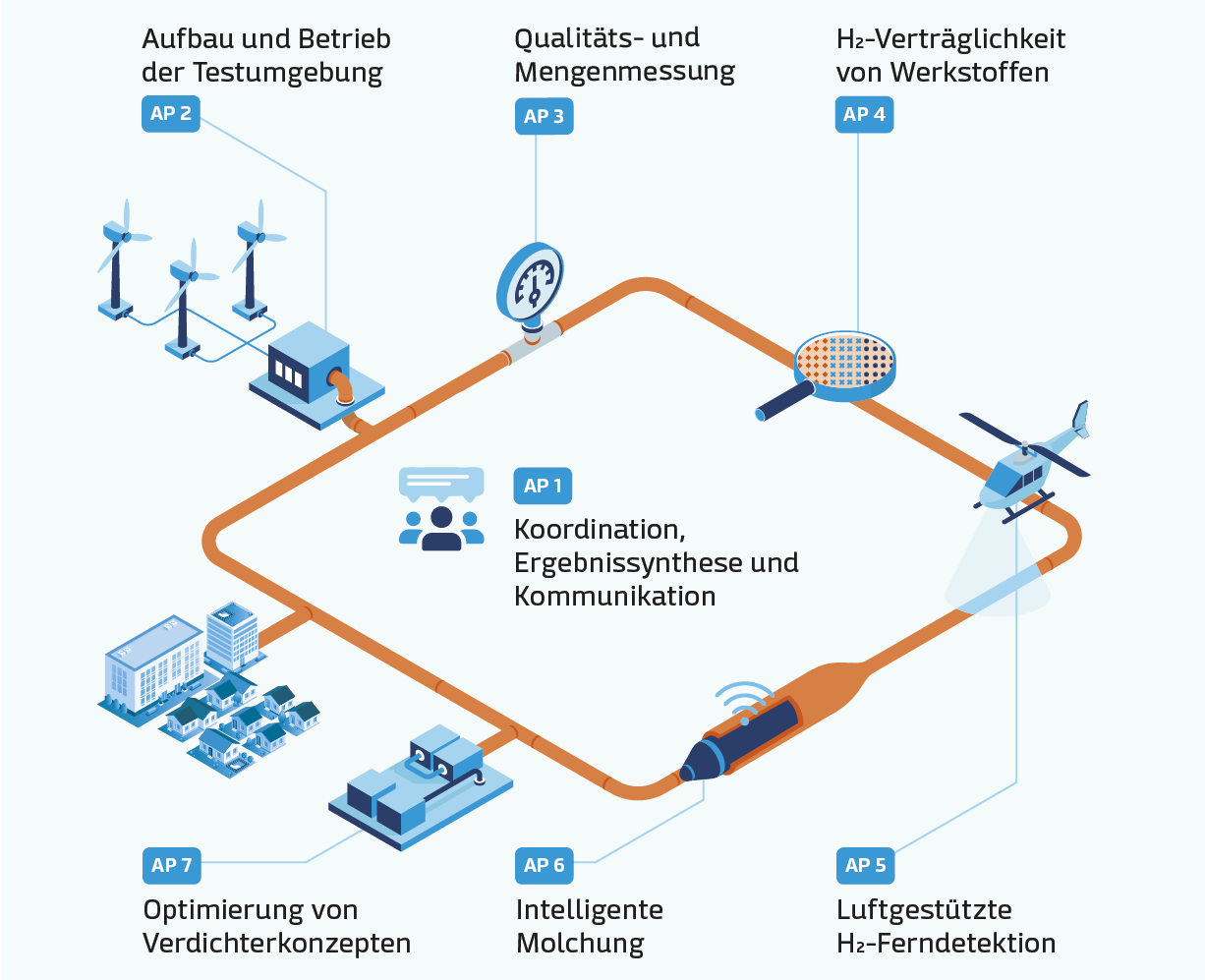 Zusätzlich dazu widmet sich das Projekt dem Wasserstoff-Transport in fünf wissenschaftlichen Projekten und schafft damit den systemischen Rahmen. Die wissenschaftlichen Projekte befassen sich mit (1) der Erstellung einer Roadmap, wie eine umfassende Wasserstoff-Infrastruktur zukünftig aussehen könnte, (2) der Erarbeitung möglicher Standards, Normen und Sicherheitsvorschriften von Wasserstoff-Transporttechnologien, (3) der Sicherheit von Wasserstoff-Transport-Technologien (Materialien, Werkstoffe und Sensorik), (3) der effizienten Lösung von Wasserstoff aus Ammoniak und (4) dem Betanken von Behältern mit flüssigem Wasserstoff (tiefkalt).