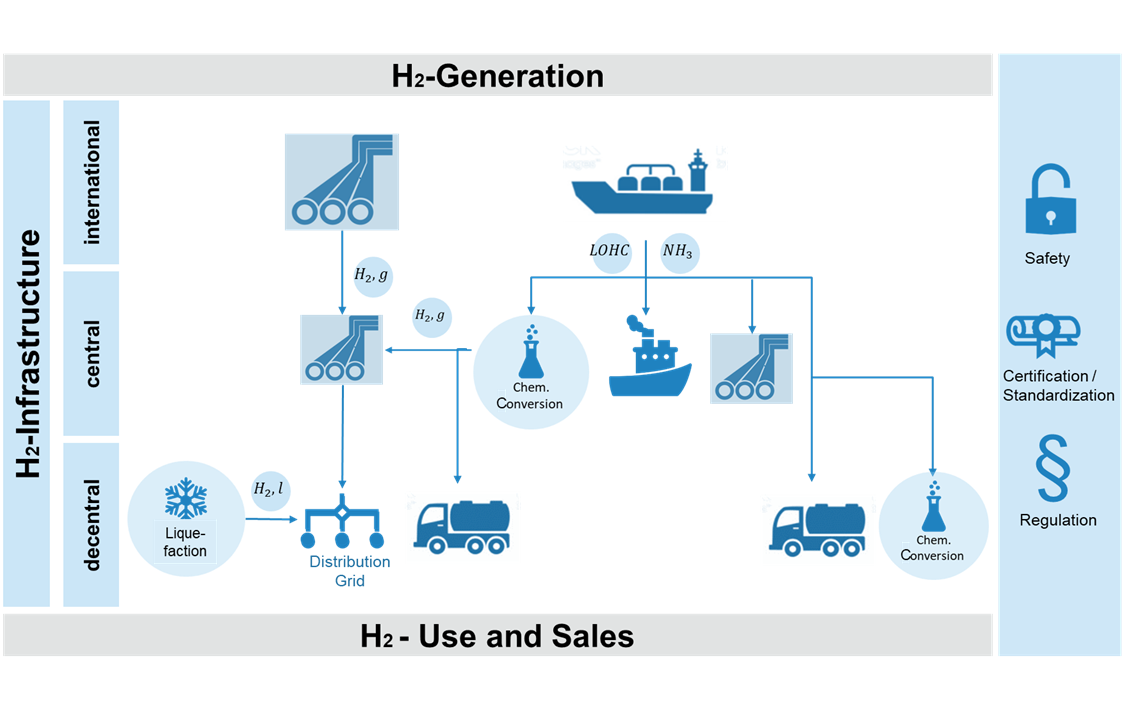 The project is also focussed on hydrogen transport in five scientific projects to establish the systemic framework. The scientific projects deal with (1) creating a roadmap to determine what a comprehensive hydrogen infrastructure could look like in the future, (2) developing possible standards and safety provisions for hydrogen transport technologies, (3) the safety of hydrogen transport technologies (materials and sensor systems), (3) efficiently splitting hydrogen from ammonia and (4) filling containers with liquid hydrogen (cryogenic).